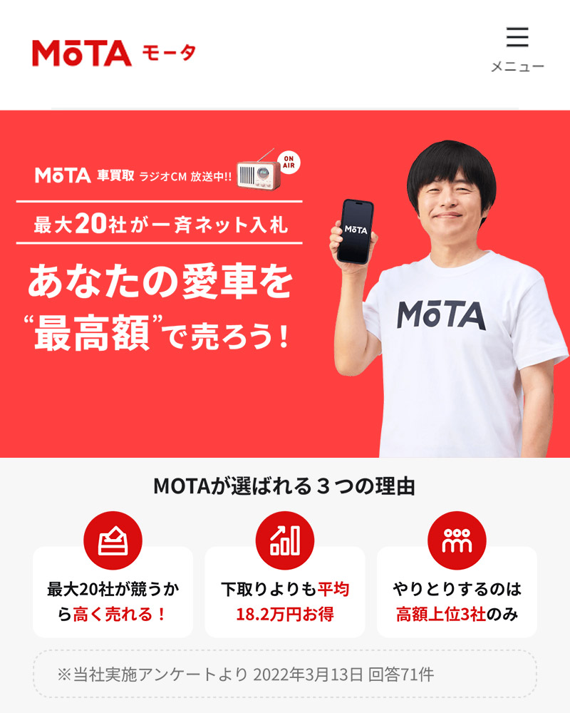 MOTA(モータ)です。買取店は、他のお店と買取金額を競う事になるので、高値での売却が期待できます。45秒で入力完了、翌日18時に買取店の査定額が一斉に表示されます。
